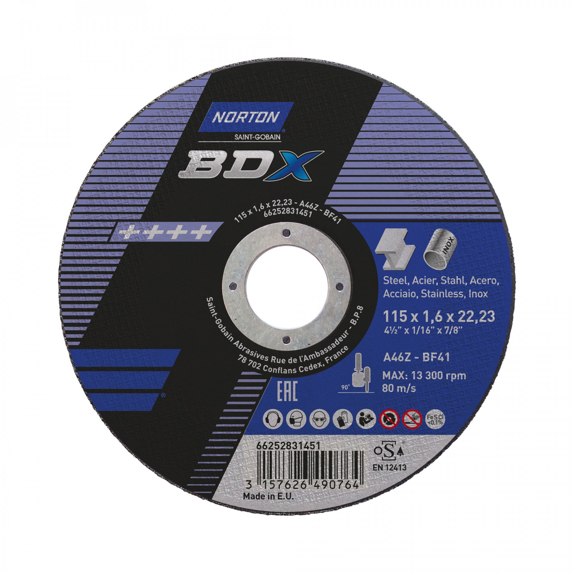 A Norton BDX fém-inox sorozat rendkívül vékony vágókorongokat kínál acél- és rozsdamentes acél széles választékához. A Norton BDX a költséghatékony vágókorongok szabványát állította be, amelyek hosszú élettartamot és gyorsabb fém eltávolítást biztosítanak az éles szilícium-karbid szemcséknek köszönhetően. Max.vágási sebesség : 80 m/s. Vas, kén és klór mentes. Nincs szennyeződés. Kevesebb rezgés.